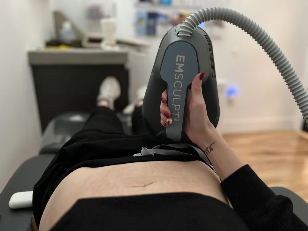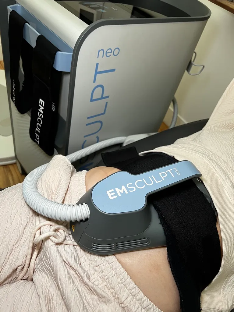 Flat paddle applicators are placed on the target area. You’ll feel rhythmic contractions and gentle warmth from the RF. It’s intense but completely tolerable — many clients read or scroll during the 30-minute session.